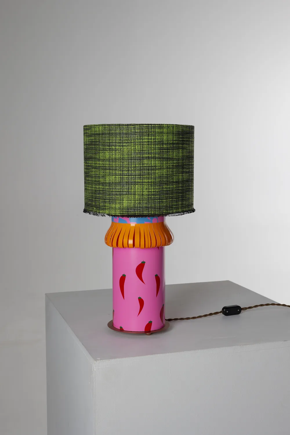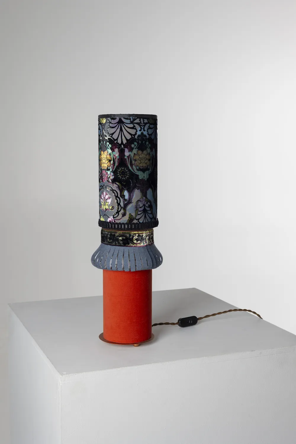 The textile wraps both shade and base, allowing the narrative to continue vertically through the form.