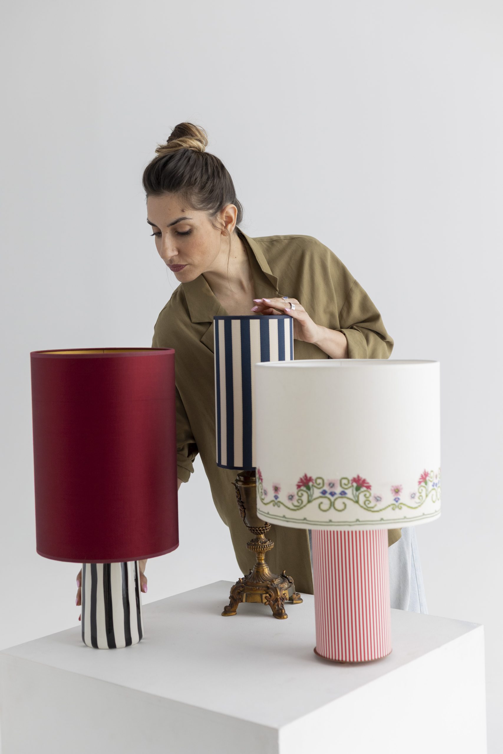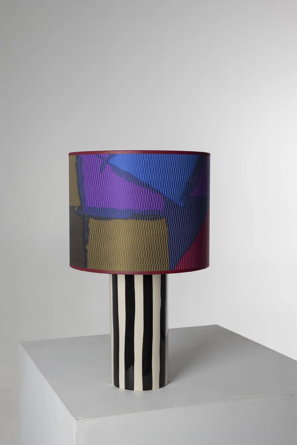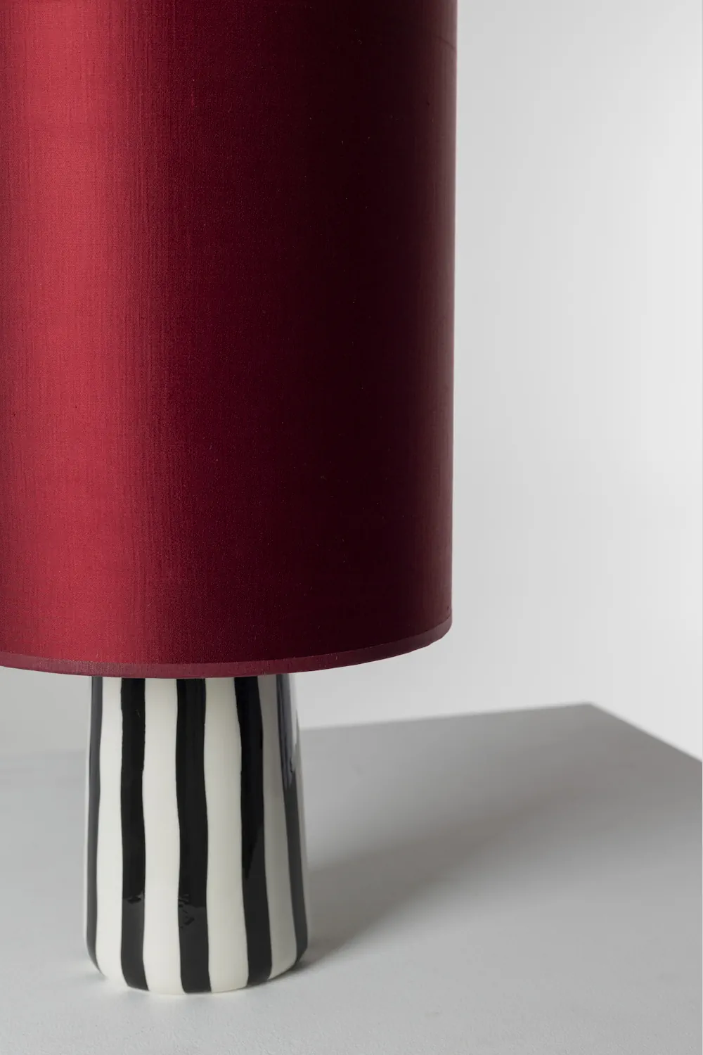 The ceramic base, finished in bold black and white stripes, introduces graphic clarity beneath the saturated silk.