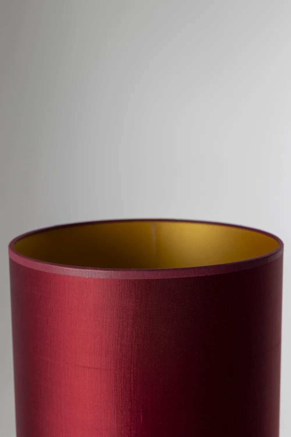 The shade is crafted from a 1950s silk curtain in a deep wine red tone. When illuminated, the gold interior lining releases a warm, amber glow — intensifying the richness of the fabric.
