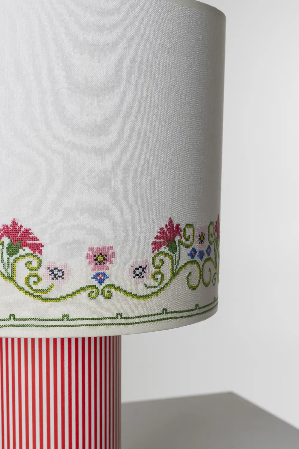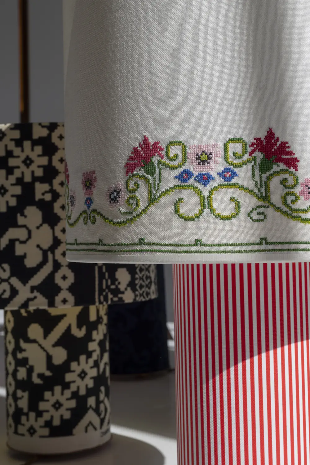 The lampshade is crafted from authentic handwoven cotton fabric from the 1960s, finished with delicate handmade cross-stitch embroidery. The figurative motif carries the presence of time — each stitch a trace of handwork and memory.