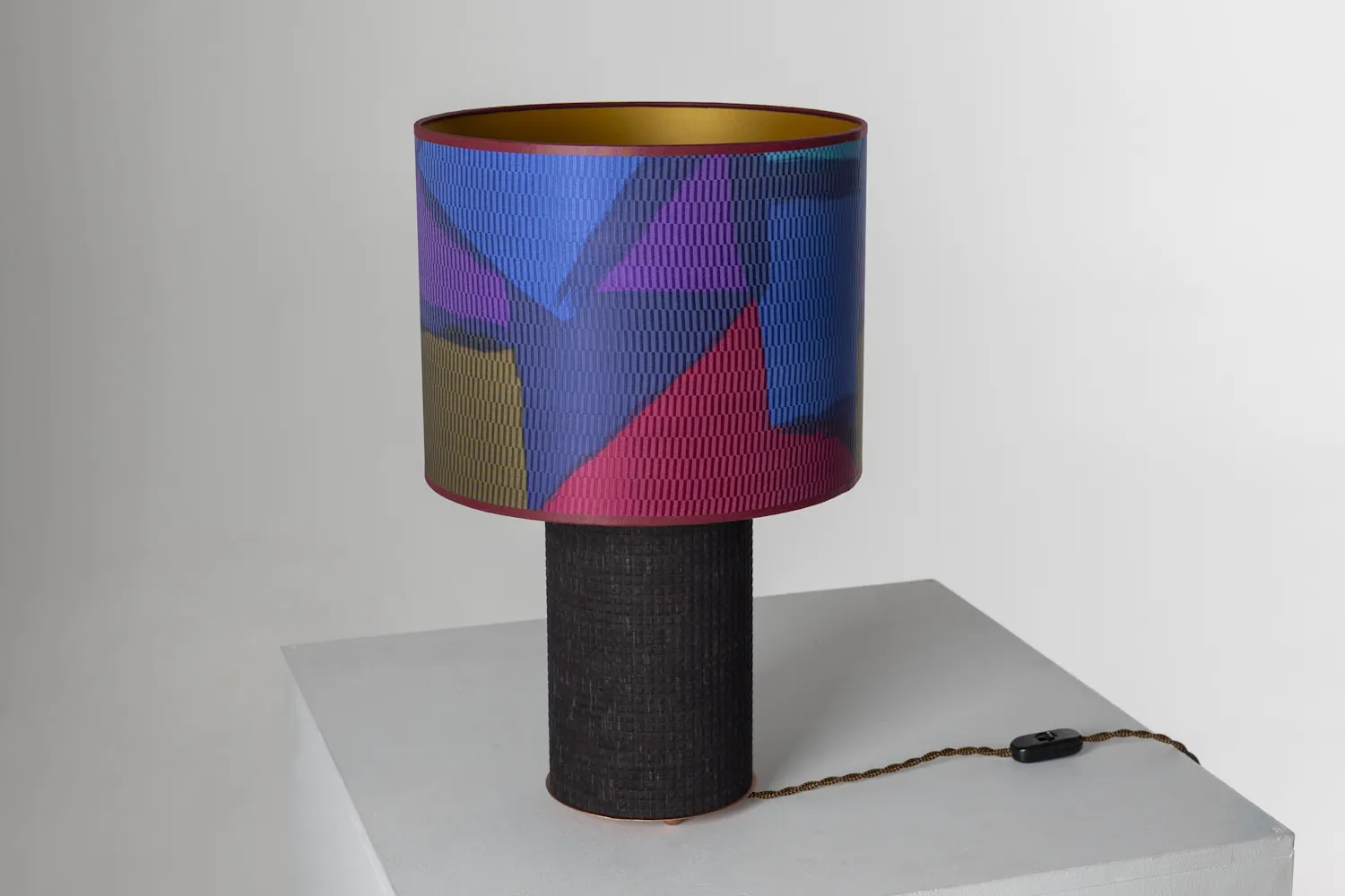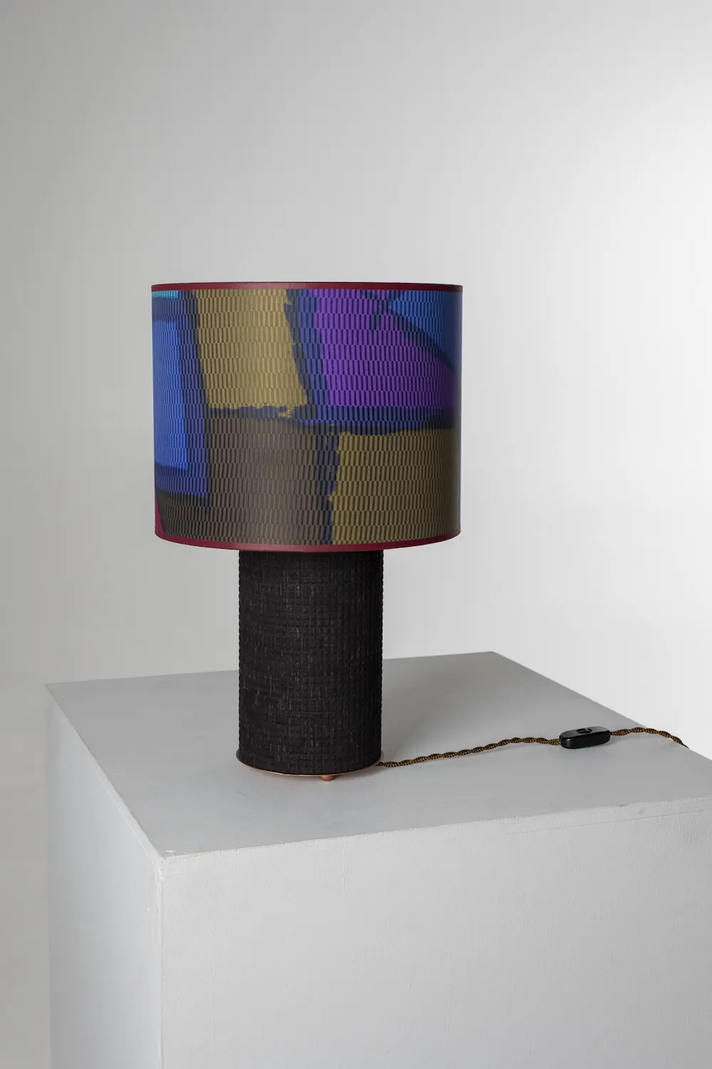 Crafted from an original 1990s structured woven textile, the shade reveals geometric forms across a subtle grid-like surface, a quiet echo of early digital aesthetics.