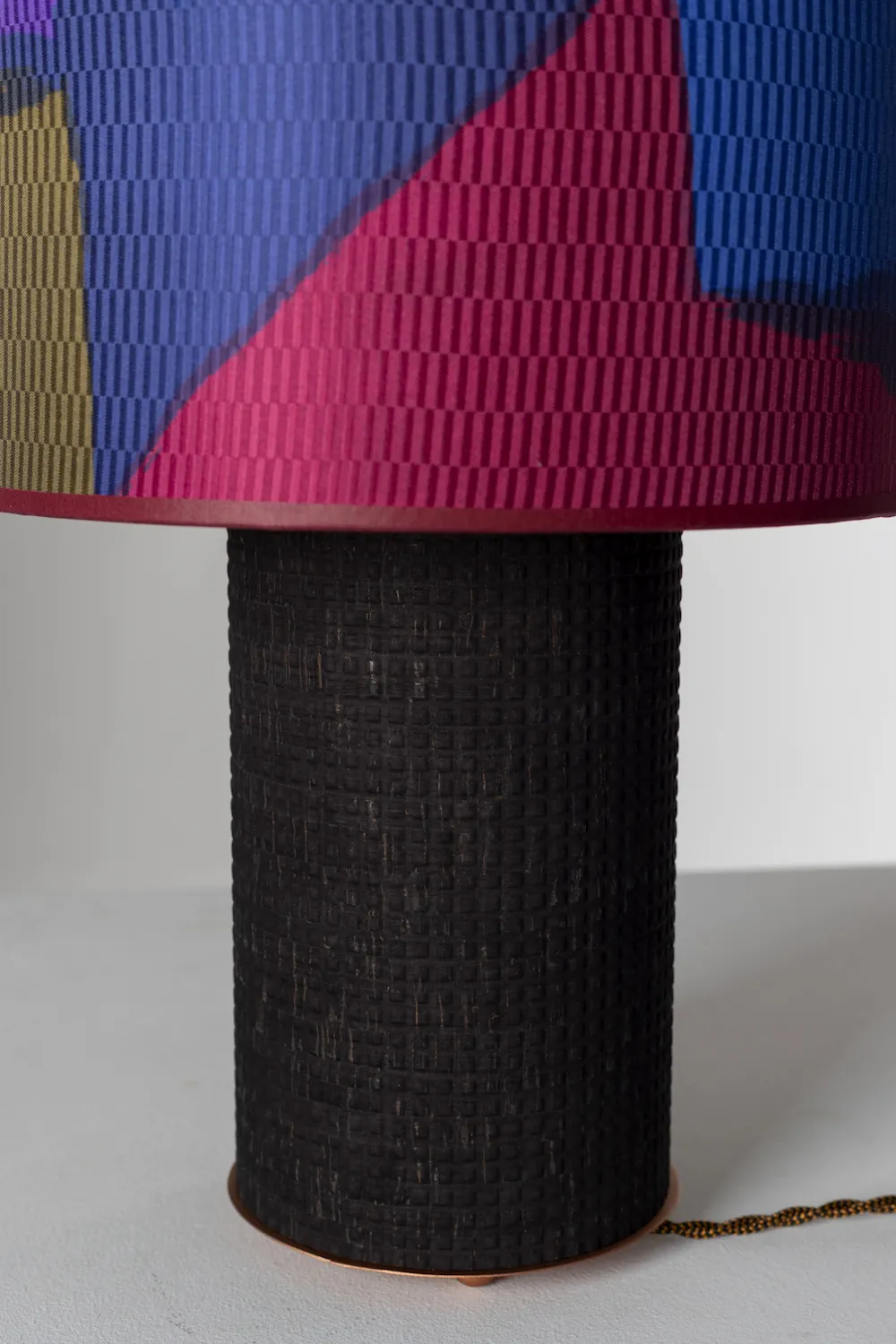 The base, wrapped in colored cork with a checker-textured surface, grounds the composition with tactile contrast, soft geometry above, earthy structure below.